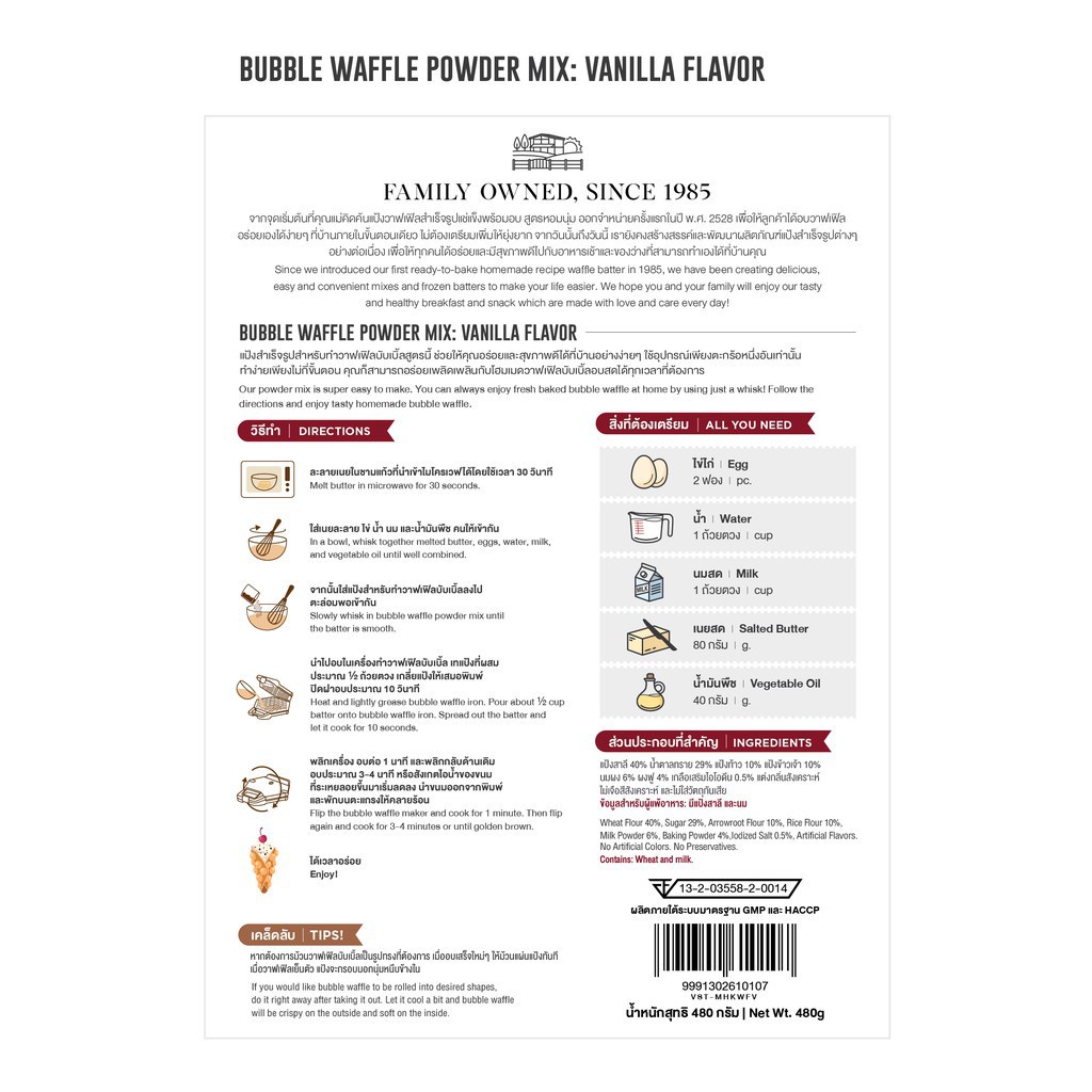 10 | Vista By Verasu แป้งวาฟเฟิลบับเบิ้ล รสวานิลลา รุ่น VST-MHKWFV | ![]() | แป้งสูตรฮ่องกง กรอบนอกนุ่มหนึบ ไร้สีสังเคราะห์และวัตถุกันเสีย | สููตรฮ่องกง | 480 กรัม | ไม่ระบุ | แป้งสาลี 40%, น้ำตาลทรายขาว 29%, แป้งเท้ายายม่อม 10%, นมผง 6%, แป้งข้าวเจ้า 10%, ผงฟู 4%, เกลือ 0.5% | วานิลลา | วานิลลา | ไม่ระบุ | ไม่ระบุ | ไม่ระบุ | ||||||