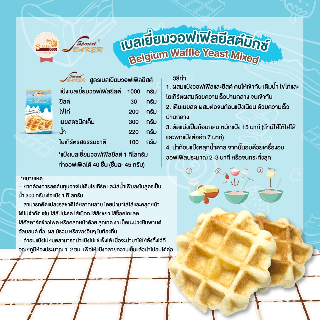 8 | Special Baker Belgium Waffle Yeast Mixed | ![]() | แป้งสำหรับผสมยีสต์ เนื้อเหนียวนุ่มฟูสไตล์วาฟเฟิลเบลเยี่ยม | สูตรเบลเยี่ยม | 1000 กรัม | 40 แผ่น | แป้งสาลี, น้ำตาล, ผงฟู | ไม่ระบุ | ดั้งเดิม | ไม่ระบุ | ไม่ระบุ | ไม่ระบุ | ไม่ระบุ | ไม่ระบุ | ไม่ระบุ | |||