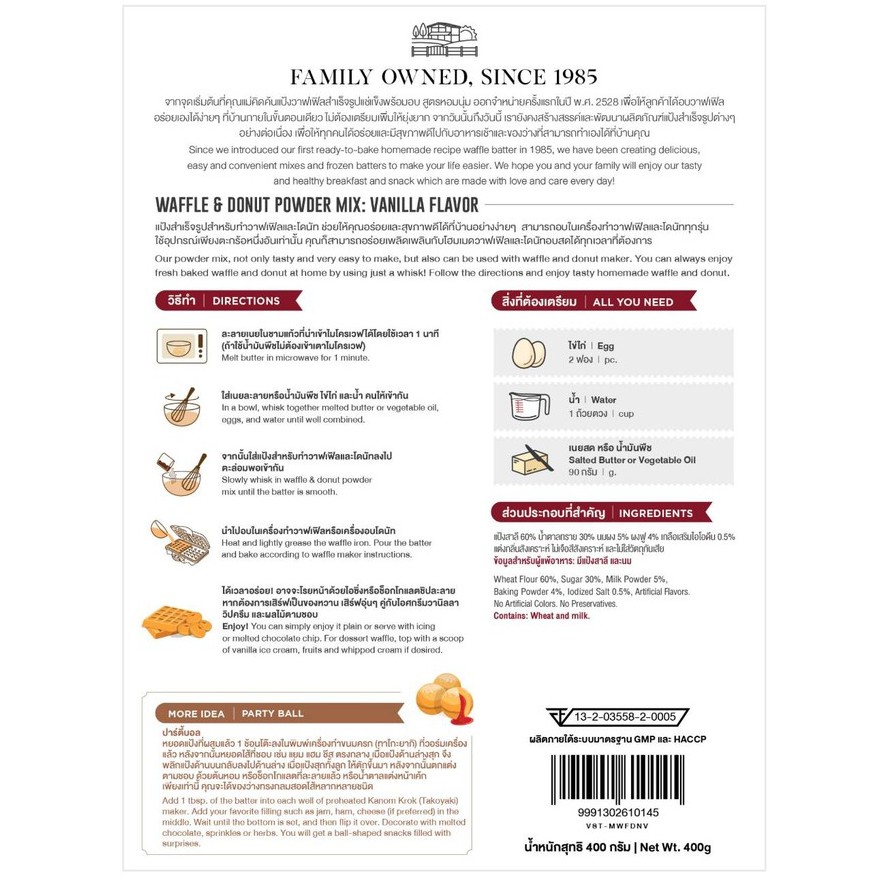 6 | Imperial American Style Waffle | ![]() | ไม่มีการผสมสีสังเคราะห์ ปลอดภัยต่อผู้บริโภค นุ่มฟูหอมเนย | สูตรมาตรฐาน/ดั้งเดิม | 400 กรัม | ไม่ระบุ | แป้งสาลี 50%, น้ำตาล 30%, เนยขาว 8%, นมผง 8%, สารช่วยให้ฟู | ไม่ระบุ | ดั้งเดิม | ไม่ระบุ | ||||||||
